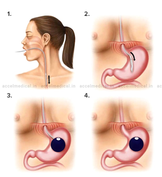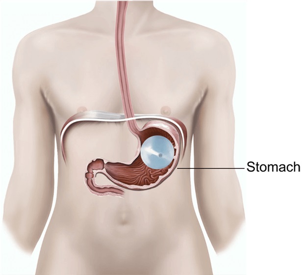 A deflated balloon is inserted through the mouth and into the stomach using an endoscope. Once inside the stomach, the balloon is inflated with a sterile saline solution.